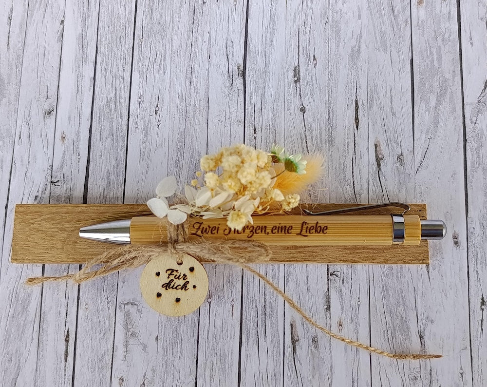 Bring frischen Style in deinen Alltag mit diesem coolen Bambuskugelschreiber! Ob in Blau oder Schwarz – die Tinte schreibt super smooth und zuverlässig. Das besondere Highlight? Das Wunschmotiv in Geschenkoptik, verziert mit Holzklötzchen und Trockenblumen, macht ihn zum echten Hingucker.