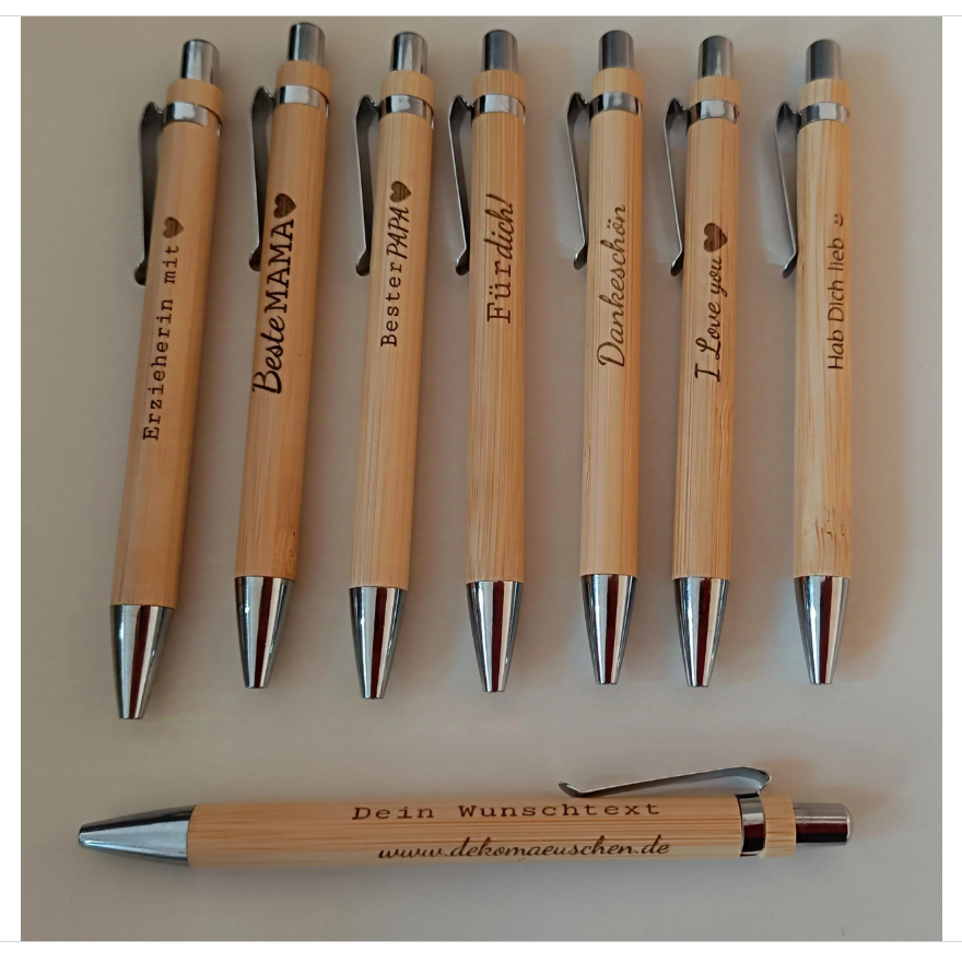 Entdecke die perfekte Kombination aus Nachhaltigkeit und persönlichem Stil den personalisierten Kugelschreibern aus hochwertigem Bambus. Jeder Kugelschreiber wird individuell gefertigt und bietet nicht nur eine umweltfreundliche Schreiblösung, sondern auch eine ganz besondere Note.
